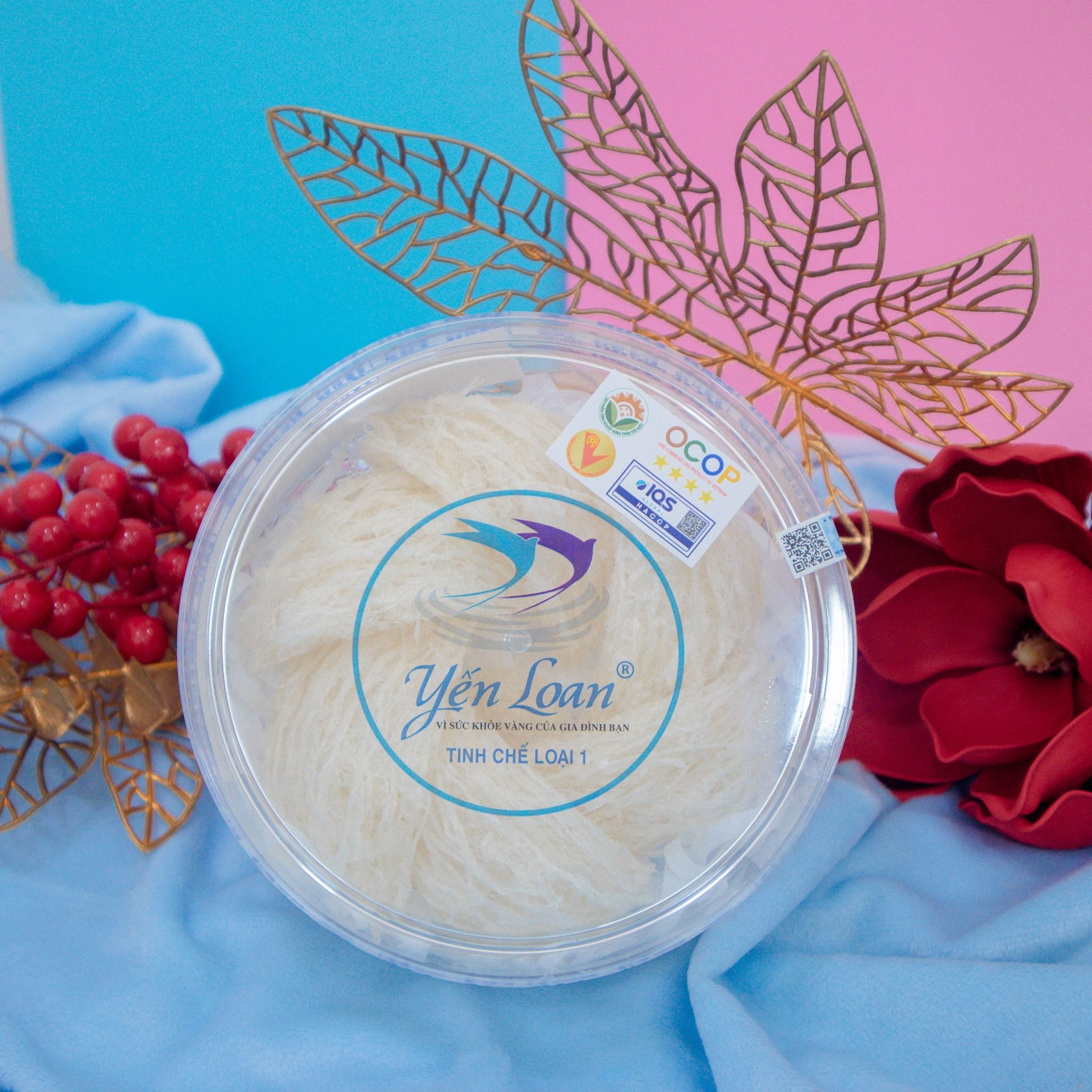 - Nguyên liệu - Quy trình SX - Chất lượng SP: được lựa chọn từ những tổ yến to vừa, hơi nhiều lông, đẹp nhưng không còn 2 chân tổ. Người thợ nhặt yến dùng cách phun sương, ủ ẩm để làm mềm tổ yến, gắp sạch lông và tạp chất ra khỏi tổ yến nhưng vẫn giữ được cả những sợi yến to, dài sau đó tái tạo lại hình dạng tổ yến ban đầu rồi đưa vào phòng sấy lạnh để cho ra sản phẩm sau cùng có chất lượng cao nhất với hàm lượng Protein đạt >55%; trong đó hàm lượng 18 các Axit amin luôn đạt >49%; Axit Sialic > 10%; Nitrit < 30ppm và có hơn 30 các nguyên tố đa, vi lượng, vitamin và khoáng chất khác đều có hàm lượng cao > 20% đã được giữ lại tối đa nhờ Phương pháp nhặt lông khô và sấy lạnh tại Yến Loan. Quy trình sản xuất đạt chứng nhận AT VSTP và kiểm sát chất lượng quốc tế AQS Global HACCP.
